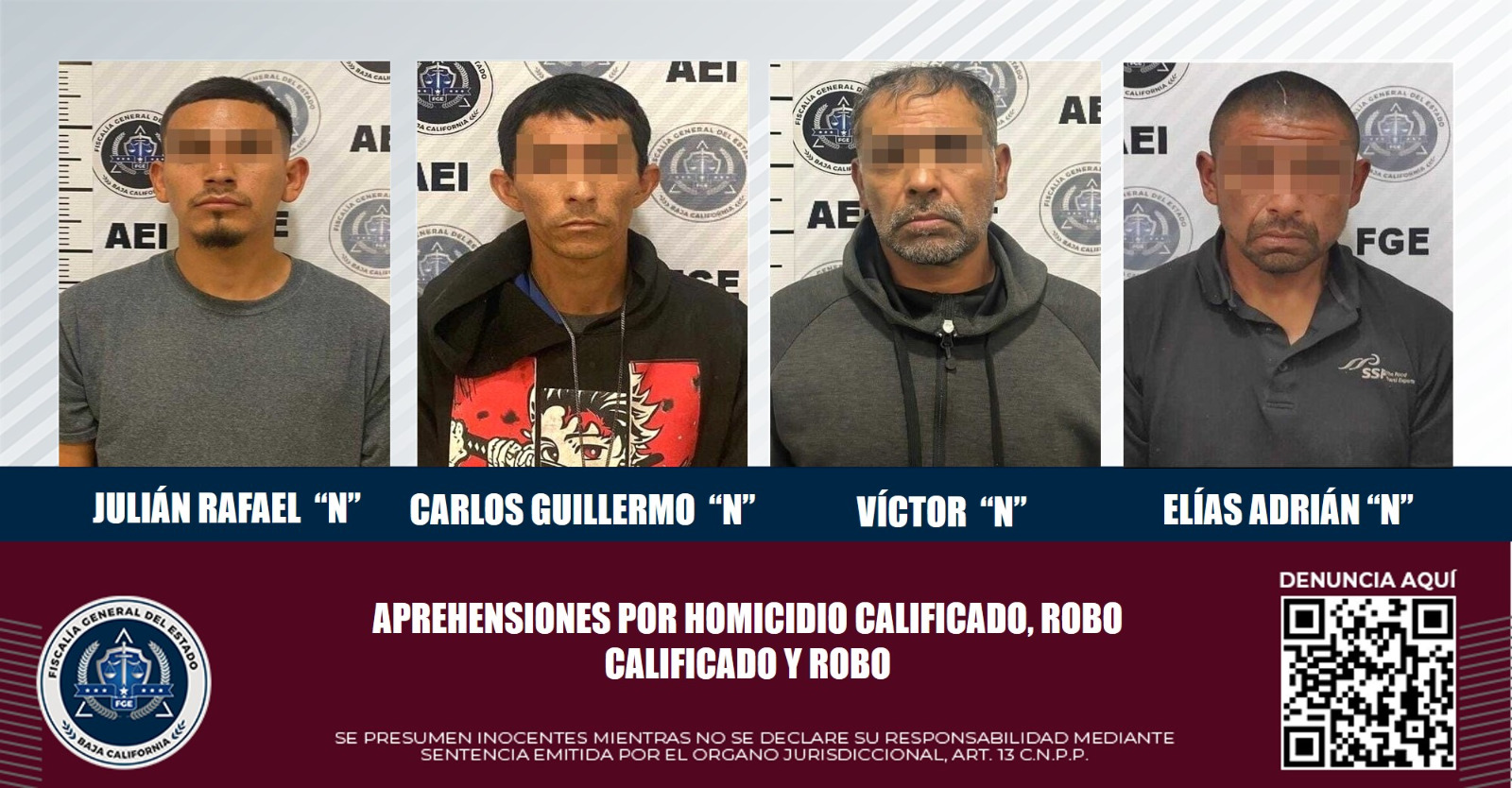TIJUANA, B.C. A través de diversas estrategias de investigación llevadas a cabo por elementos de la Agencia Estatal de Investigación, de la Fiscalía General del Estado, se logró dar cumplimiento a órdenes de aprehensión contra cuatro individuos que se encontraban prófugos de la justicia por diversos delitos.