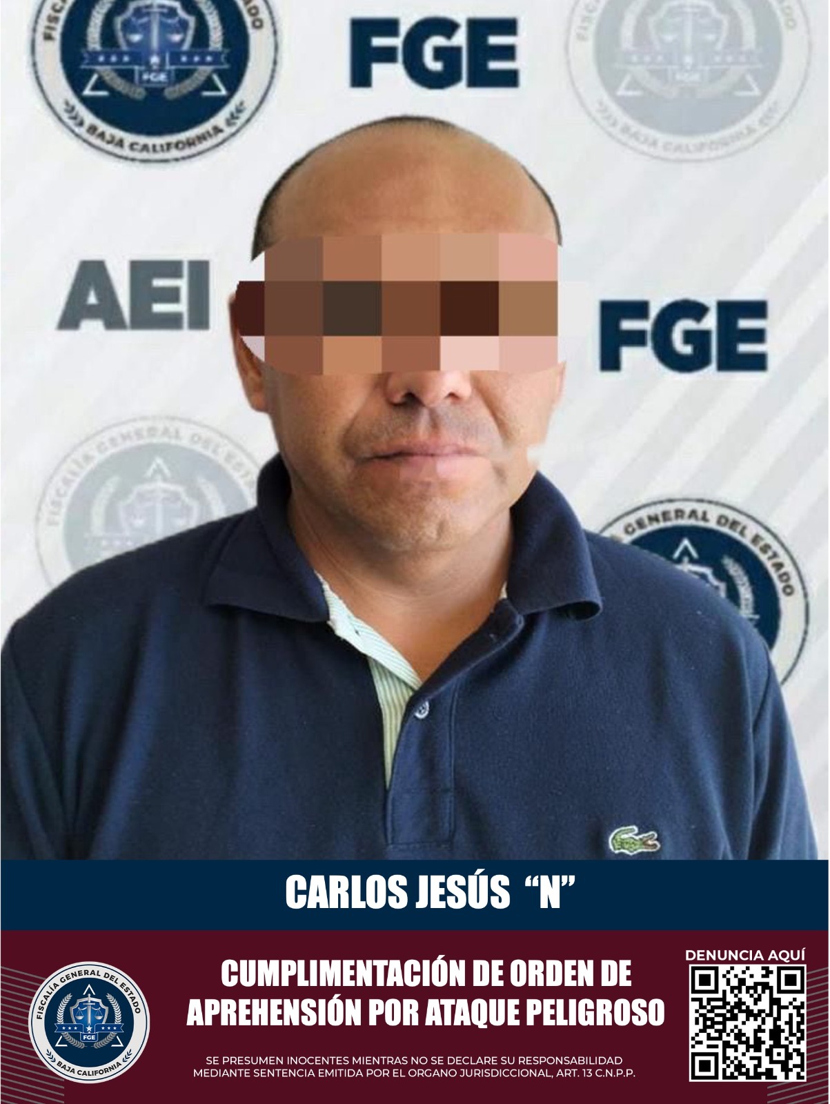 MEXICALI, B.C. La Fiscalía Regional de Mexicali, a través del trabajo realizado por agentes de investigación, obtuvo la cumplimentación de una orden de aprehensión en contra de Carlos Jesús “N”, por presuntamente cometer el delito de ataque peligroso.