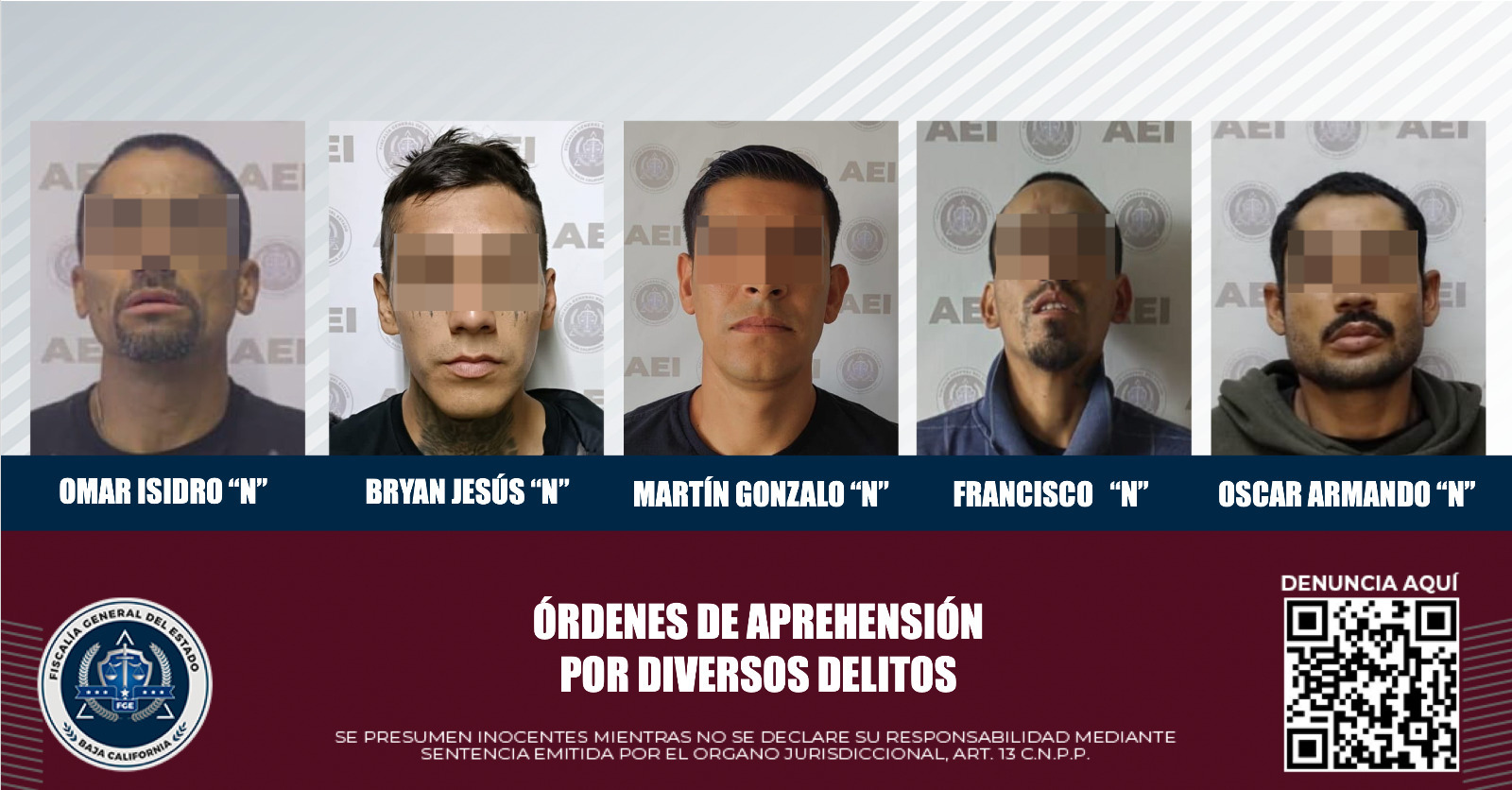 ENSENADA, B.C. Agentes de la Fiscalía General del Estado capturaron a cinco sujetos a través de órdenes de aprehensión por su presunta participación en actos delictivos.