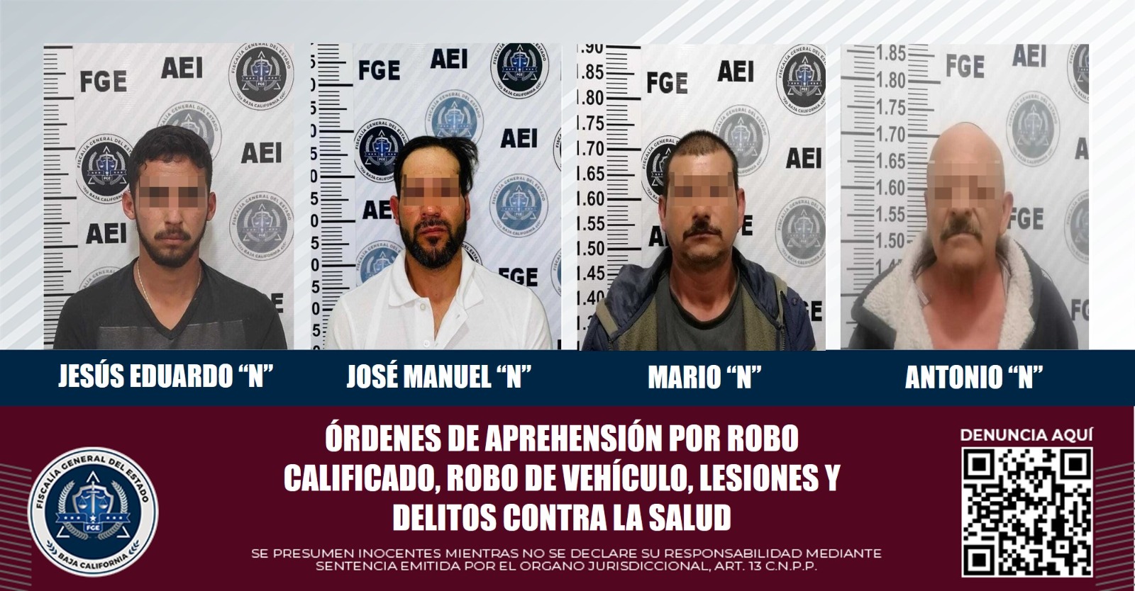 TIJUANA, B.C. En seguimiento a las acciones de investigación en la persecución de los delitos, elementos de la Fiscalía General del Estado, adscritos a la Agencia Estatal de Investigación (AEI), cumplimentaron mandatos judiciales por robo calificado, robo de vehículo, lesiones y delitos contra la salud.