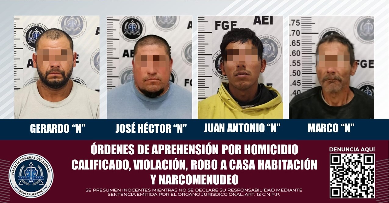 TIJUANA, B.C. La Fiscalía General del Estado, a través de la Unidad de Aprehensiones de la Agencia Estatal de Investigación, capturó a cuatro imputados por los delitos de homicidio calificado, violación, narcomenudeo y robo calificado a casa habitación.