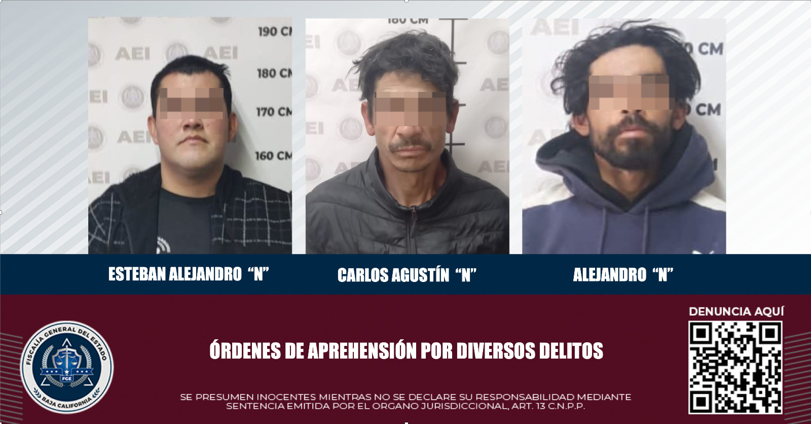 ENSENADA, B.C. Como resultado de diversas acciones de campo e investigación, elementos de la Fiscalía General del Estado cumplimentaron órdenes de aprehensión en contra de tres hombres que habrían cometido ilícitos en la localidad.