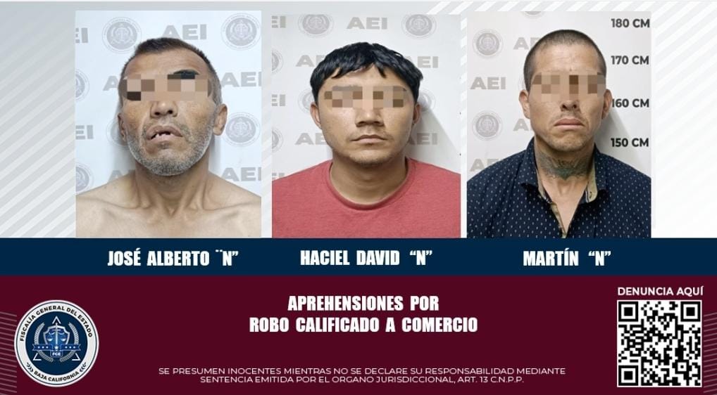 ENSENADA, B.C. Por el delito de robo calificado a establecimiento abierto al público, la Fiscalía General del Estado (FGE), cumplimentó tres órdenes de aprehensión en contra de tres sujetos, que habrían cometido el citado ilícito, en distintas acciones.