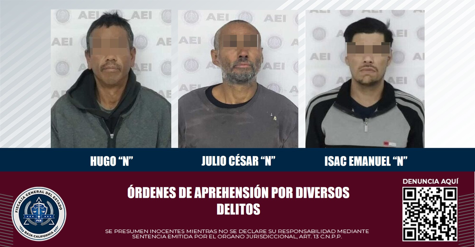 TECATE, B.C. Elementos de la Agencia Estatal de Investigación (AEI) pertenecientes a la Fiscalía General del Estado, dieron cumplimiento a tres mandatos judiciales por los delitos de robo de vehículo, narcomenudeo e incumplimiento de las obligaciones de asistencia familiar.