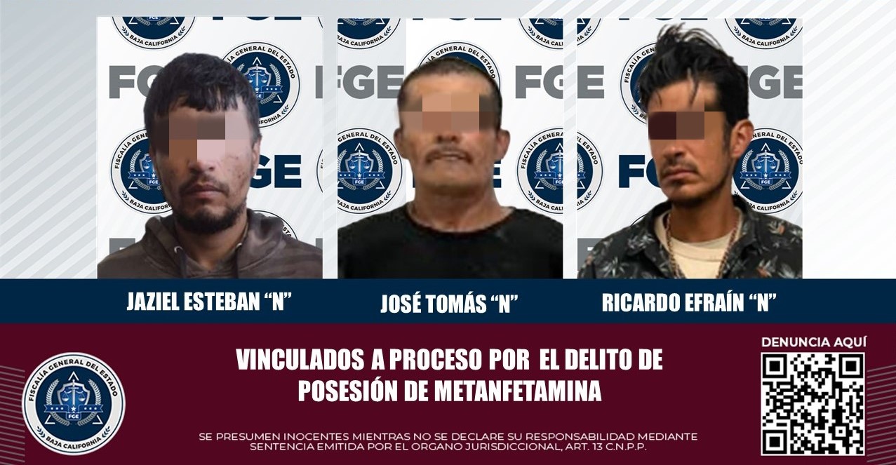 En primer término, se vinculó a proceso a Jaziel Esteban “N”, ya que se le imputa el delito contra la salud en la variante de posesión de metanfetamina, a él se le aseguró el 21 de noviembre de 2023 en la calle Cuero de Venados y Alfredo Ames de la colonia La Mina en Playas de Rosarito, en posesión de 5 envoltorios con dicha droga.