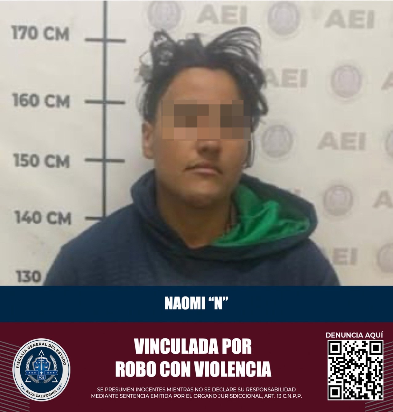 ENSENADA, B.C. A través de datos de prueba, la Fiscalía Regional de Ensenada logró el inicio del proceso penal contra una mujer, a quien se le atribuye el robo con violencia cometido en un colectivo el pasado 26 de noviembre. Sobre este asunto se informó que la imputada Naomi “N” fue detenida a las 15:17 horas de ese día, por medio de un operativo policial en el fraccionamiento Bahía. Momentos antes, esta mujer, presuntamente, asaltó la negociación "JMB", al amenazar con una pistola de
