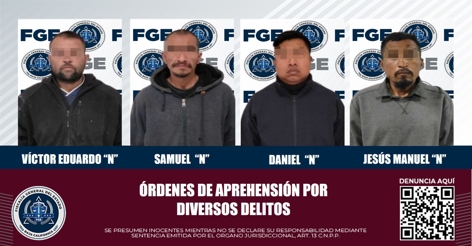 PLAYAS DE ROSARITO, B.C. Elementos de la Agencia Estatal de Investigación (AEI) de la Fiscalía General del Estado (FGE) llevaron a cabo la ejecución de cuatro órdenes de aprehensión por distintos delitos; las personas arrestadas fueron puestas a disposición de la autoridad competente.