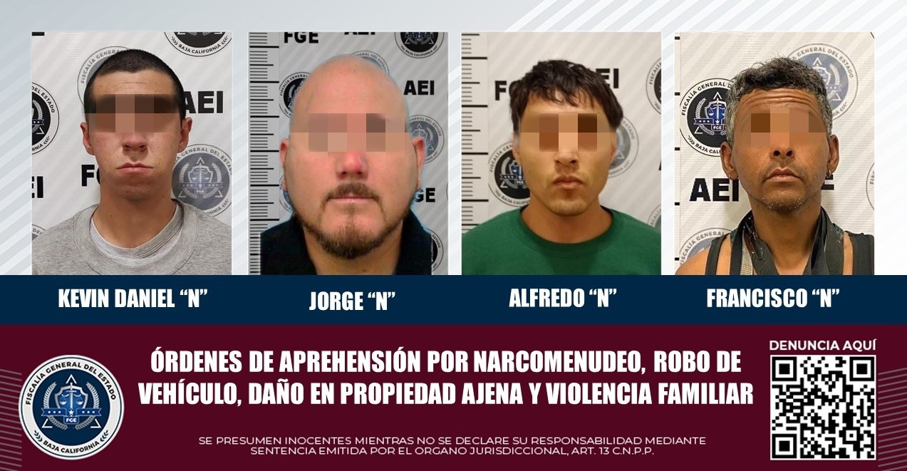 TIJUANA, B.C. La Fiscalía General de Baja California, logró a través de su corporación policiaca aprehender a cuatro imputados por diversos delitos, ya que contaban con mandatos judiciales vigentes, por lo que luego de su detención, quedaron a disposición de la autoridad jurisdiccional correspondiente.