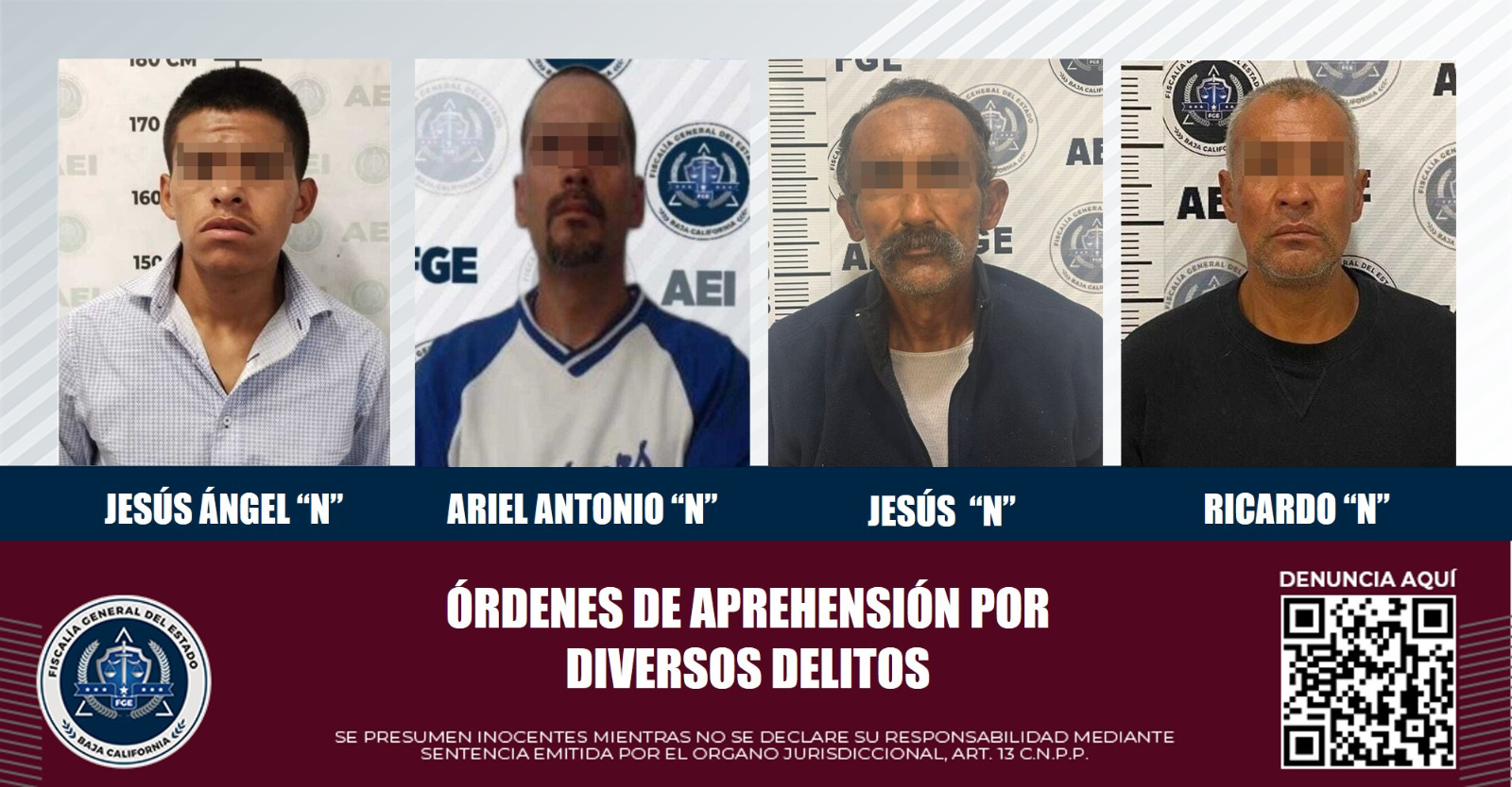 TIJUANA, B.C. Cuatro individuos que contaban con orden de aprehensión activa fueron detenidos y llevados ante jueces de control, una vez que se efectuó trabajo de investigación por parte de elementos de la Agencia Estatal de Investigación (AEI) de la Fiscalía General del Estado (FGE).