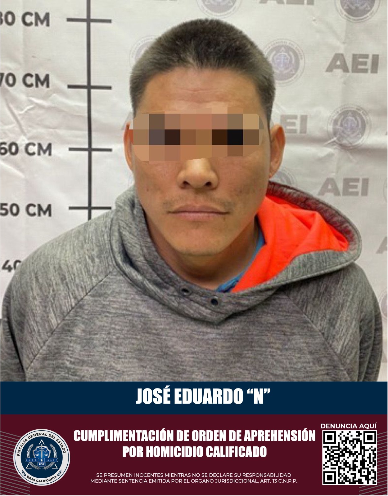 MEXICALI, B.C. La Fiscalía General del Estado, a través de la Agencia Estatal de Investigación, cumplimentó una orden de aprehensión en donde se obtuvo la captura de José Eduardo “N”, por su presunta comisión en el delito de homicidio calificado por ventaja.