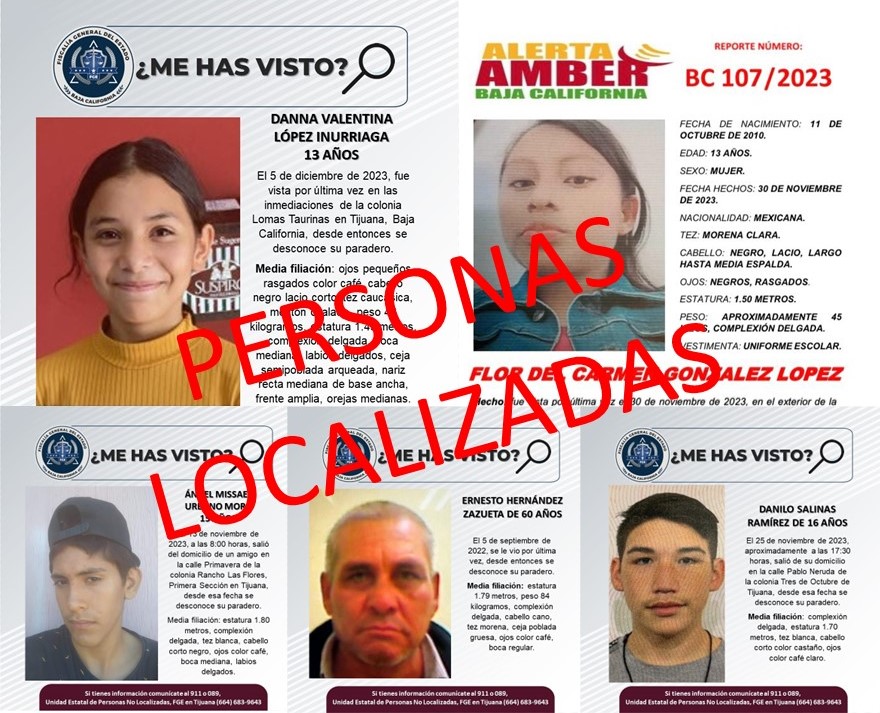 TIJUANA, B.C. La Fiscalía General de Baja California informa que ha localizado a cinco personas, tres hombres y dos mujeres, quienes contaban con reporte de búsqueda, entre los que se encuentran cuatro menores de edad.