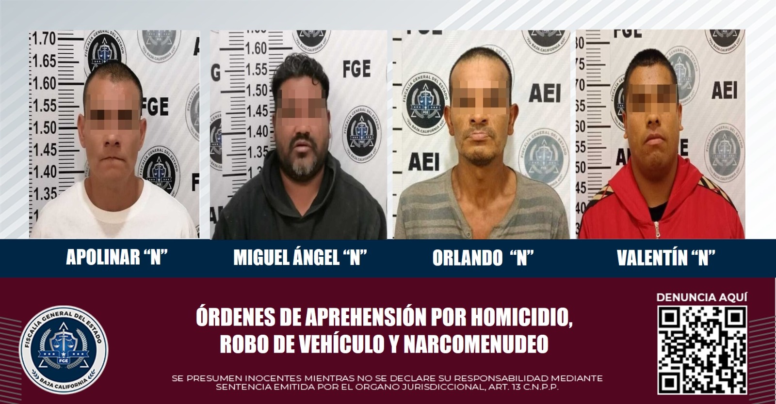 TIJUANA, B.C. A disposición de jueces de control quedaron cuatro individuos, lo anterior, una vez que elementos de la Agencia Estatal de Investigación de la Fiscalía General del Estado, les cumplimentaran la orden de aprehensión activa que tenían en su contra por el delito que se les acusa.