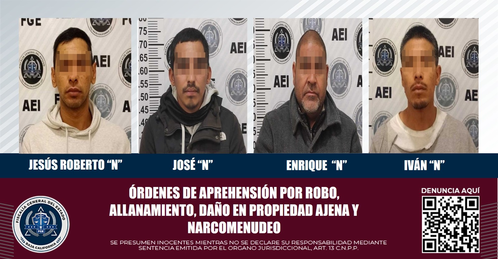 TIJUANA, B.C. Agentes estatales de investigación (AEI) de la Fiscalía General del Estado, dieron cumplimiento a mandatos judiciales emitidos por jueces de control, en contra de cuatro sujetos que en asuntos por separado son investigados por robo, allanamiento de morada, daño en propiedad ajena y narcomenudeo.