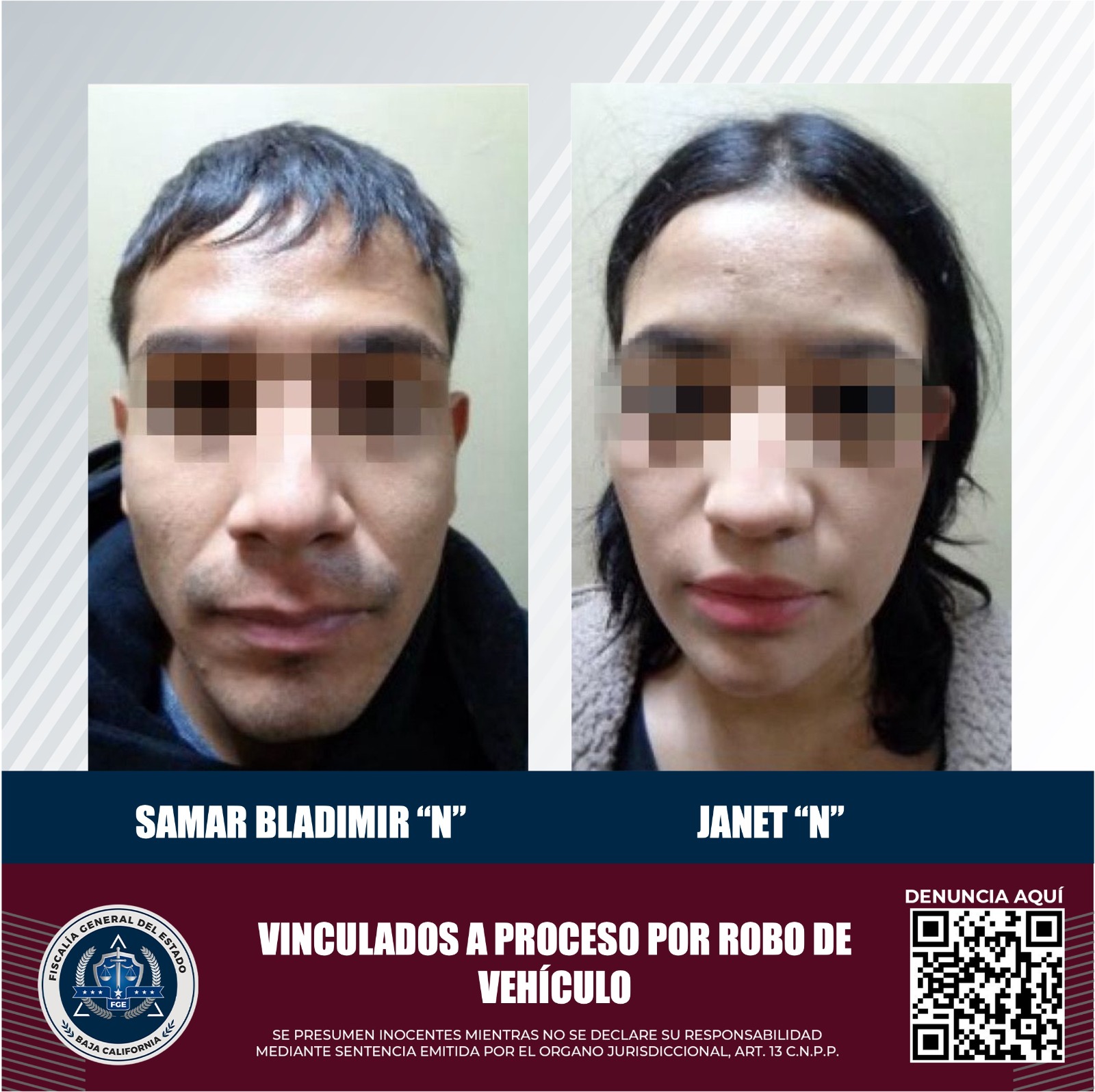MEXICALI, B.C. La Fiscalía Regional de Mexicali, mediante el trabajo realizado por la Unidad de Investigación de Robo de Vehículos Poniente, en la integración de la carpeta de investigación, obtuvo la vinculación a proceso de Samar Bladimir “N” y Janet “N”, por la presunta comisión del delito de robo de vehículo.