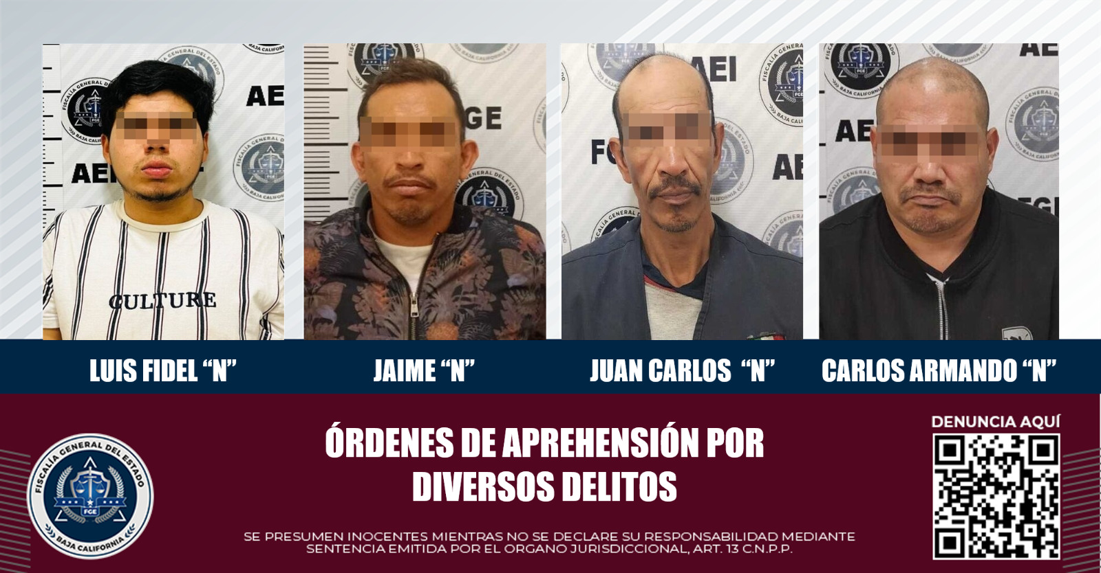 TIJUANA, B.C. La Fiscalía General del Estado (FGE), a través de la Unidad de Aprehensiones de la Agencia Estatal de Investigación (AEI), dio cumplimiento a cuatro mandamientos judiciales por los delitos de violación equiparada, robo de vehículo, robo calificado y robo a casa habitación. Las personas detenidas se encuentran a disposición de la autoridad correspondiente.