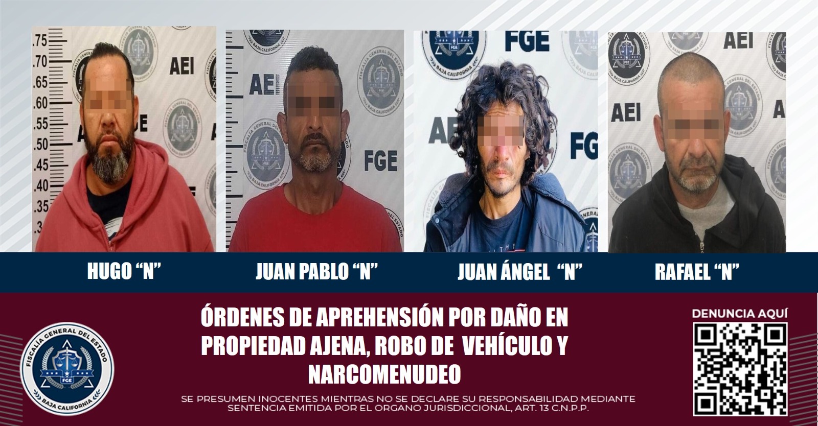TIJUANA, B.C. El trabajo de gabinete y campo realizado por la Fiscalía General del Estado, derivó en que elementos de la Agencia Estatal de Investigación (AEI) aprehendieran a cuatro individuos con mandatos judiciales; dos investigados por robo de vehículo, uno por daño en propiedad ajena y otro por narcomenudeo.