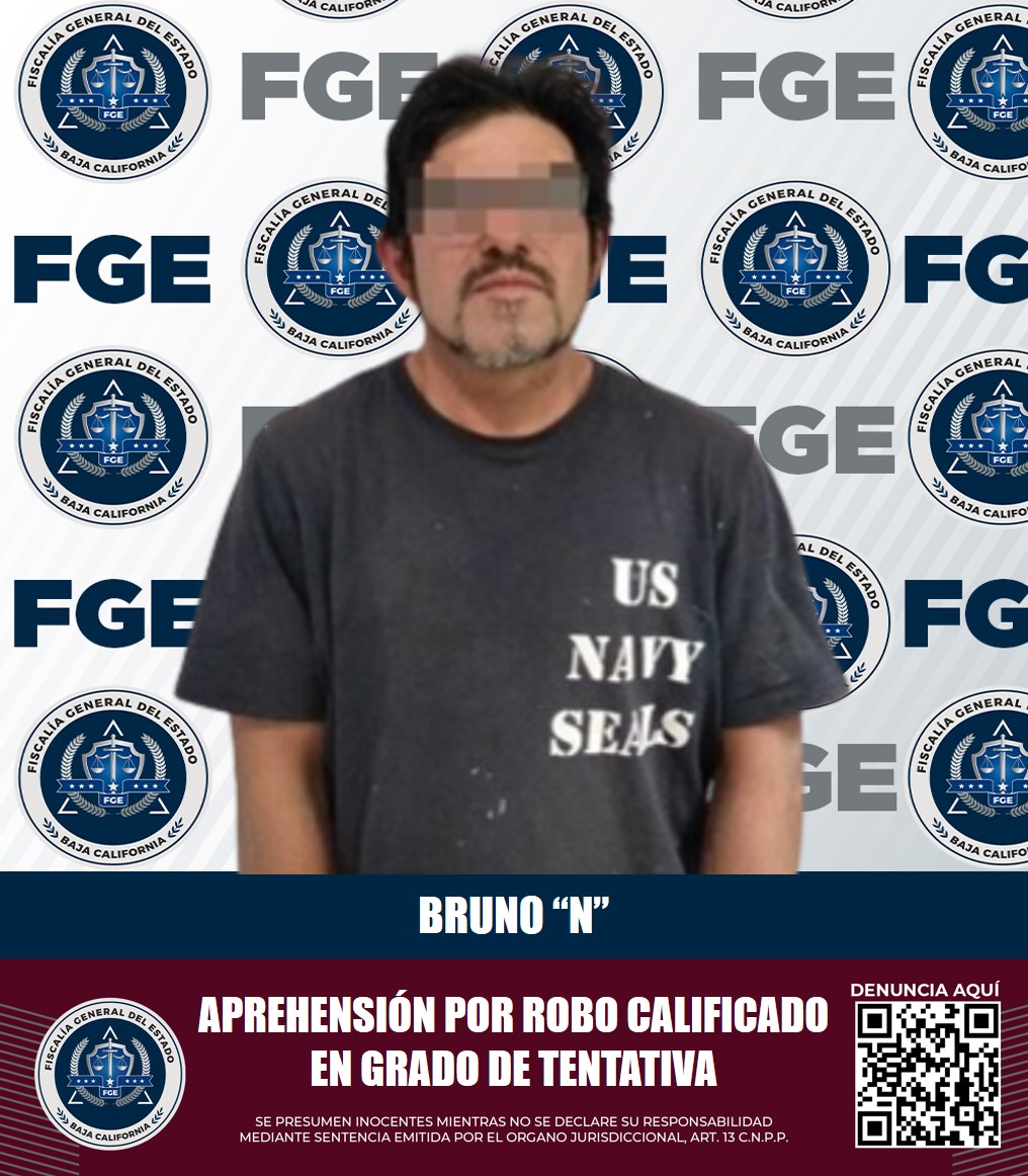 PLAYAS DE ROSARITO, B.C. La Fiscalía General del Estado informa que, como resultado de acciones de investigación llevadas a cabo por la Agencia Estatal de Investigación, se logró la captura de Bruno "N", presunto responsable del delito de robo calificado en grado de tentativa cometido en un establecimiento comercial abierto al público.