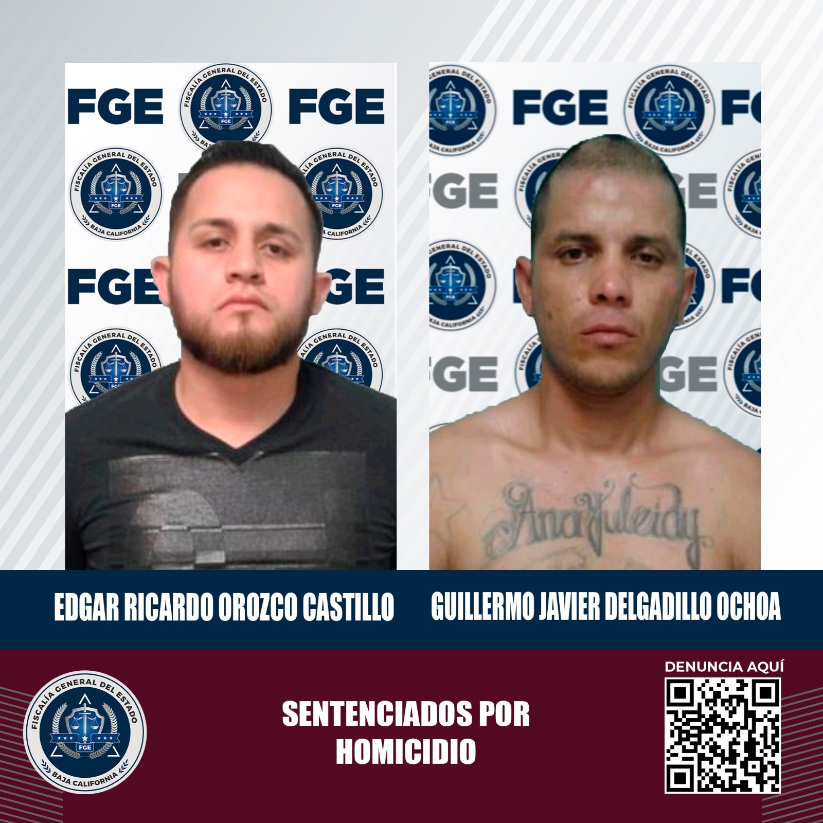 MEXICALI, B.C. Después de presentar la carpeta de investigación con elementos probatorios sólidos, la Fiscalía General del Estado obtuvo, durante un Juicio Oral, una sentencia de 30 años de prisión en contra de Edgar Ricardo Orozco Castillo y Guillermo Javier Delgadillo Ochoa, acusados de los delitos de homicidio calificado, robo y robo de vehículo.