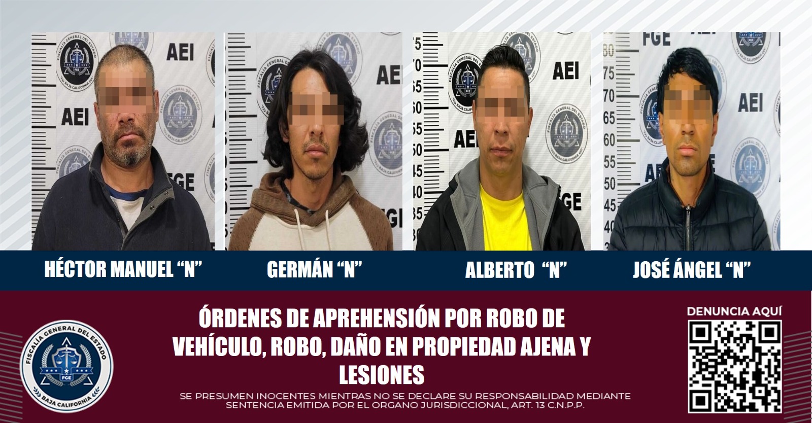 TIJUANA, B.C. Cuatro individuos que contaban con orden de aprehensión, en asuntos por separado, fueron detenidos y puestos a disposición de jueces de control, tras diligencias efectuadas por la Fiscalía General del Estado a través de la Agencia Estatal de Investigación (AEI).