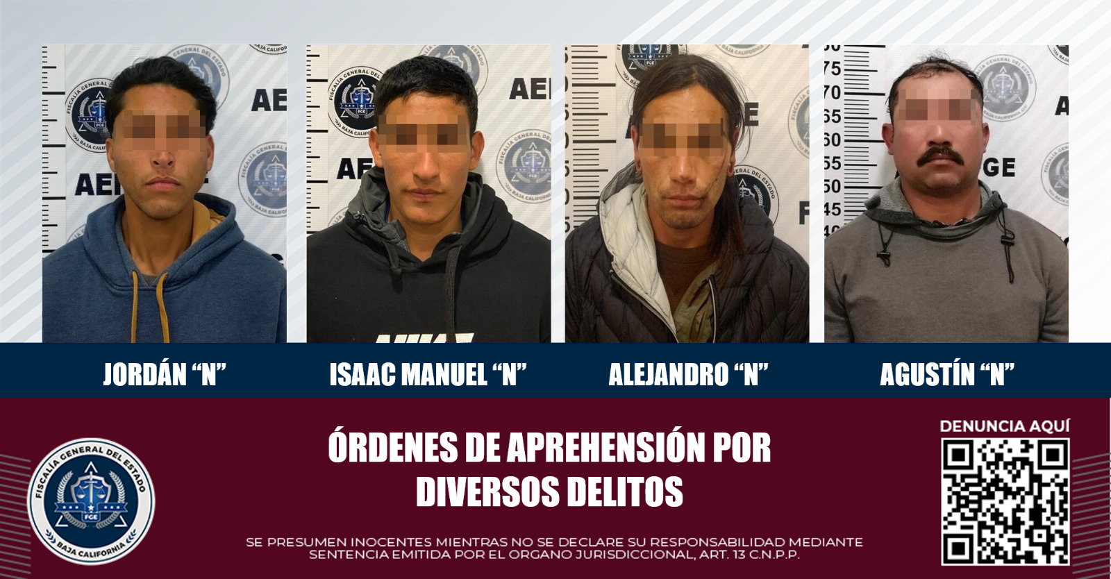 TIJUANA, B.C. La Fiscalía General del Estado informa sobre la captura de cuatro individuos que intentaban evadir la justicia y que ahora están a disposición de jueces de control para responder por el ilícito que se les imputa.