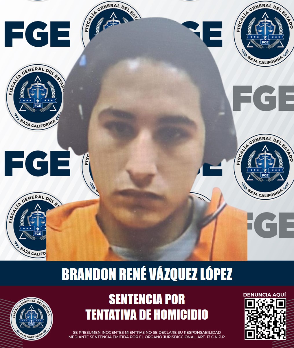 TIJUANA, B.C. Después de ser declarado penalmente responsable del delito de homicidio calificado con ventaja en grado de ejecución de tentativa, Brandon René Vázquez López, alias "El Tato", fue sentenciado a 13 años y 4 meses de prisión. La Fiscalía Especializada en Delitos Contra la Vida presentó los datos y elementos de prueba que derivaron en esta pena privativa de la libertad.