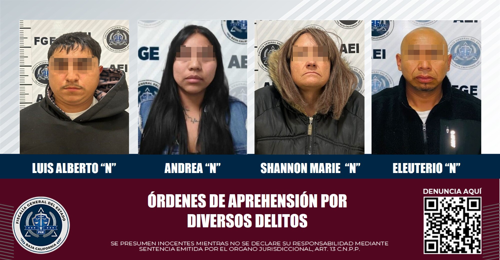 TIJUANA, B.C. Elementos de la Agencia Estatal de Investigación (AEI) de la Fiscalía General del Estado (FGE) ejecutaron cuatro órdenes de aprehensión por los delitos de tentativa de homicidio, robo calificado y violencia familiar.
