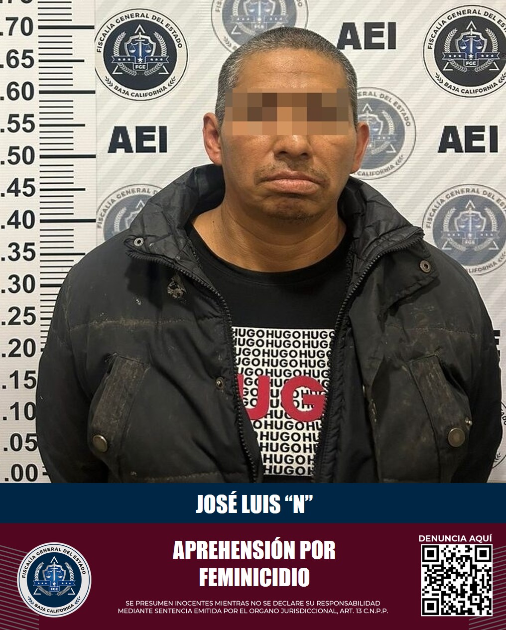TIJUANA, B.C. Derivado de una investigación realizada por la Fiscalía General del Estado (FGE) por el delito de feminicidio, se obtuvo una orden de aprehensión en contra de José Luis “N”, alias “El Niño”. Agentes estatales de investigación, tras cumplimentar dicho mandato, lo pusieron a disposición de la autoridad judicial que ordenó su arresto.