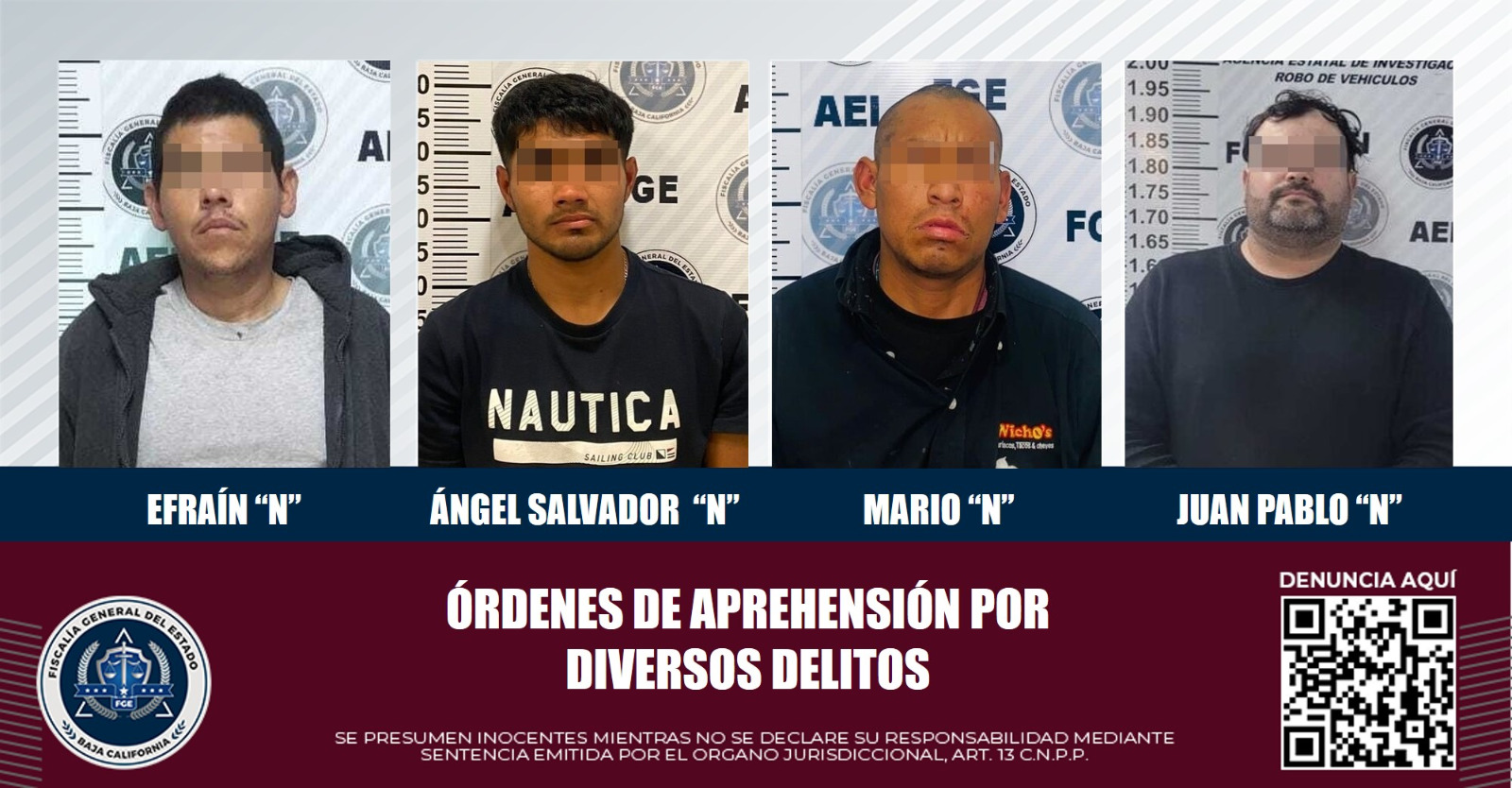 TIJUANA, B.C. Elementos de la Agencia Estatal de Investigación (AEI), adscritos a la Fiscalía General del Estado (FGE), llevaron a cabo la ejecución de cuatro mandatos judiciales relacionados con los delitos de pederastia, robo de vehículo, robo y ataque peligroso.