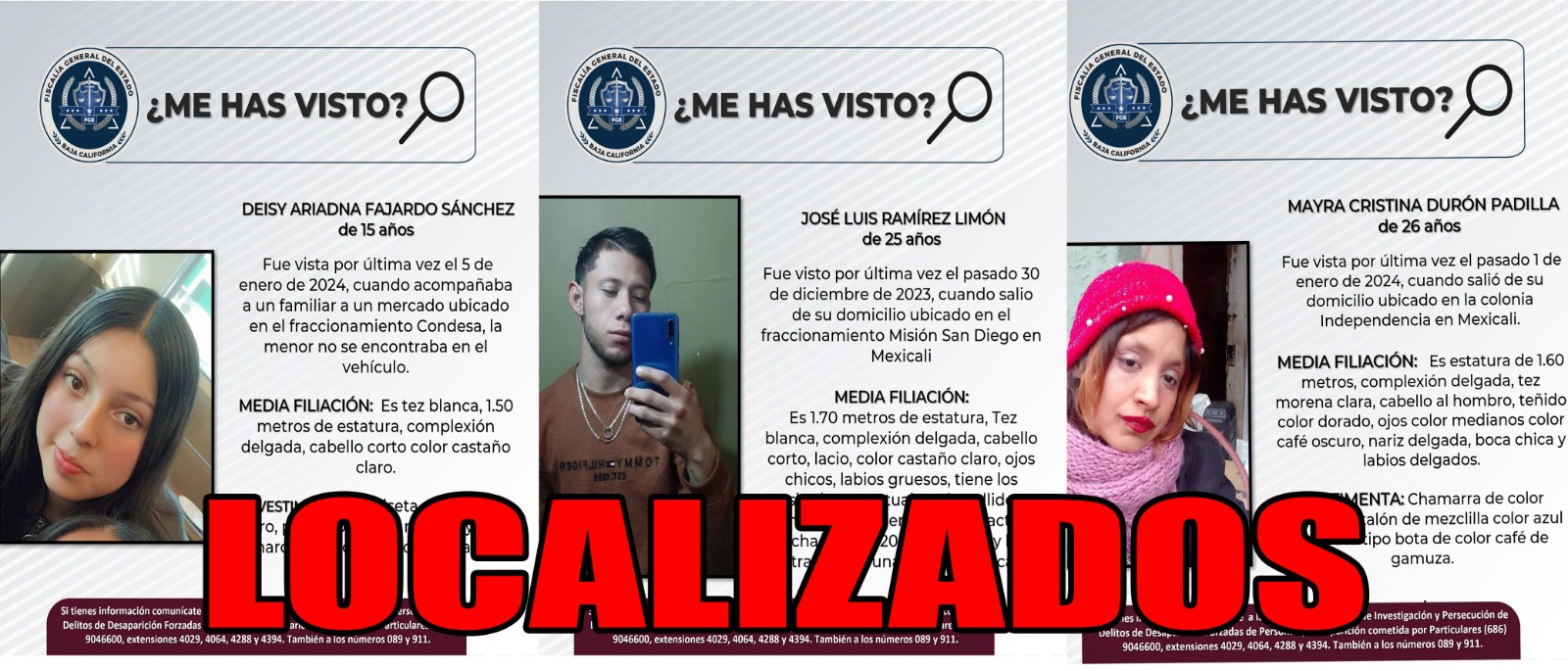 Por lo anterior, la FGE cancela las pesquisas generadas para la localización de Mayra Cristina Durón Padilla de 26 años, Deisy Ariadna Fajardo Sánchez de 15 años y José Luis Ramírez Limón de 25 años.