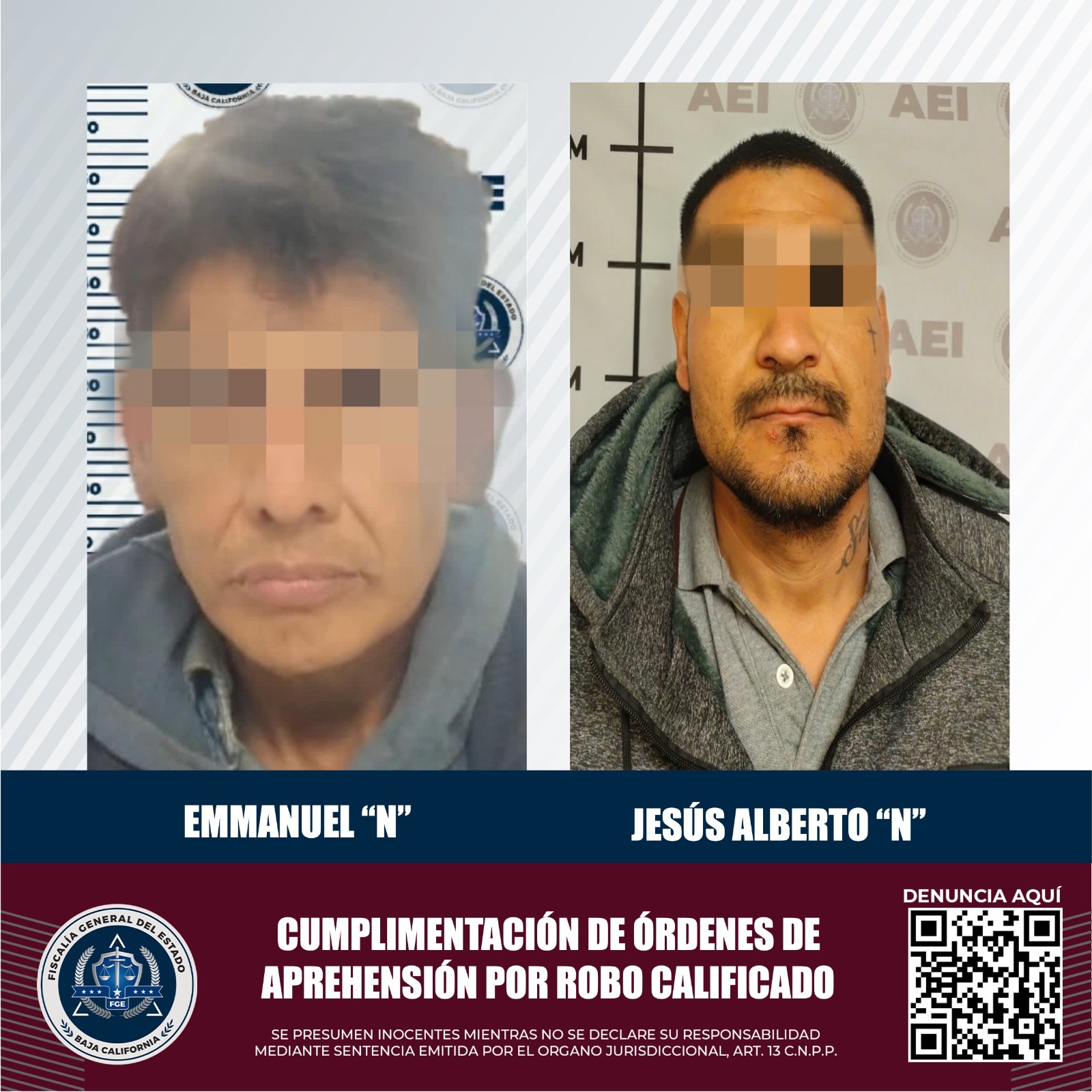 MEXICALI, B.C. La Fiscalía General del Estado, a través de las Unidades de Investigación de Ciudad Morelos y de Delitos con Detenido Zona Oriente, obtuvo que el juez girara orden de aprehensión para dos hombres que presuntamente cometieron el delito de robo calificado, en hechos por separado.