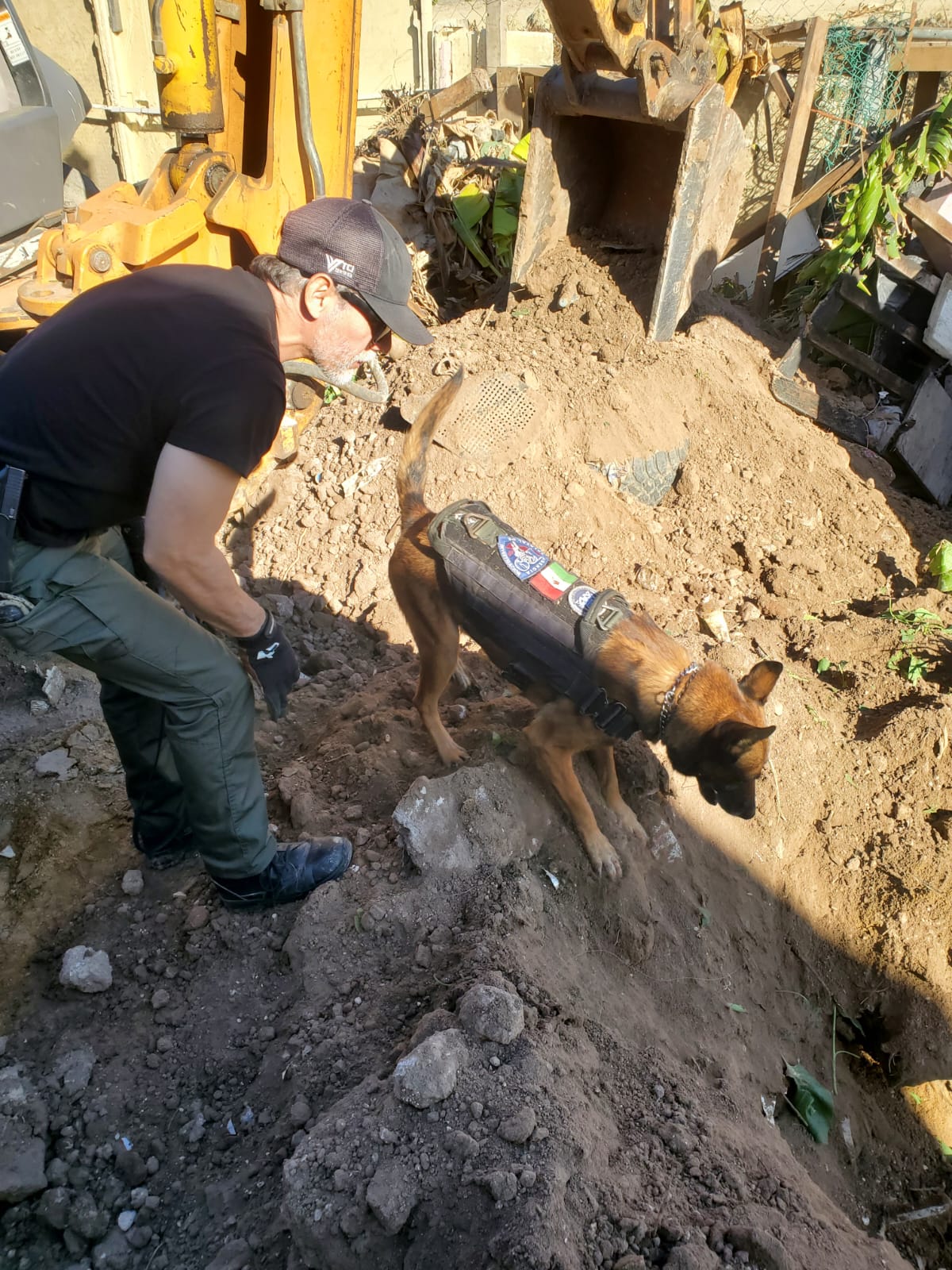 Posteriormente se realizaron intervenciones en pozos y zanjas en el predio, incluso el binomio canino revisó detalladamente la zona, pero no se alertó de algún hallazgo, a pesar del uso de las varillas “T”, para la inspección en las áreas con movimiento de tierra.