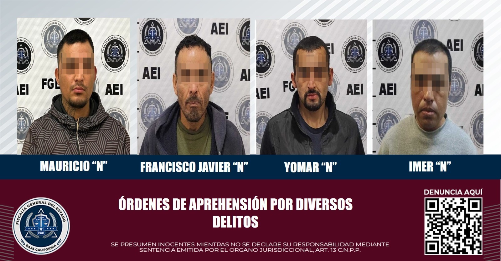 TIJUANA, B.C. Como parte de las acciones de persecución de los delitos, la Fiscalía General del Estado (FGE) a través de la Agencia Estatal de Investigación (AEI) cumplimentó diversas órdenes de aprehensión durante el desarrollo de diligencias judiciales en las cuales quedaron detenidos cuatro individuos, quienes fueron puestos a disposición de jueces de control.