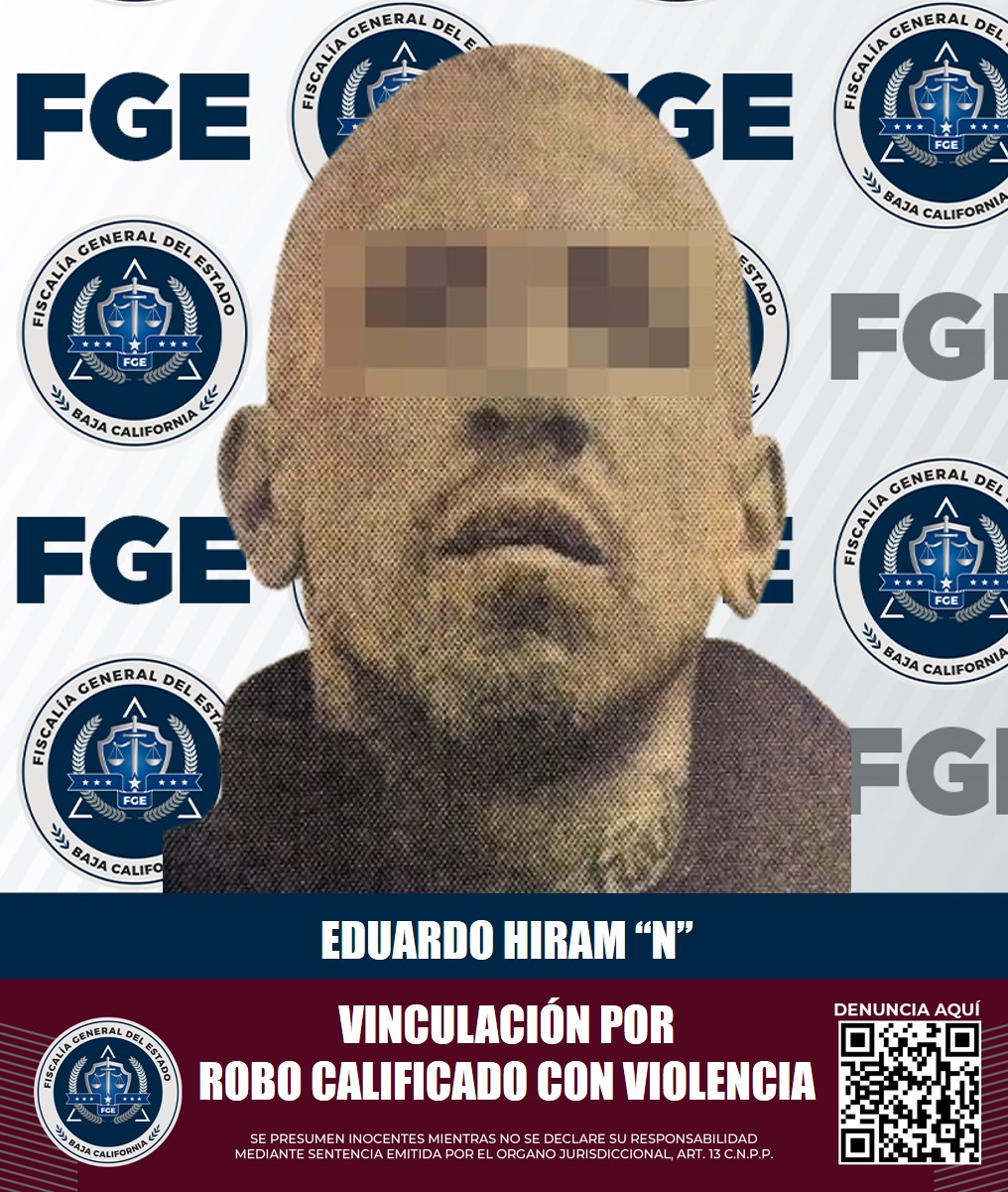 TIJUANA, B.C. Por su presunta responsabilidad en el delito de robo calificado a comercio abierto al público ejecutado con violencia, la Fiscalía Regional de Tijuana obtuvo la vinculación a proceso de Eduardo Hiram “N”, por su presunta responsabilidad en un hecho delictivo ocurrido el 4 de enero de 2024.