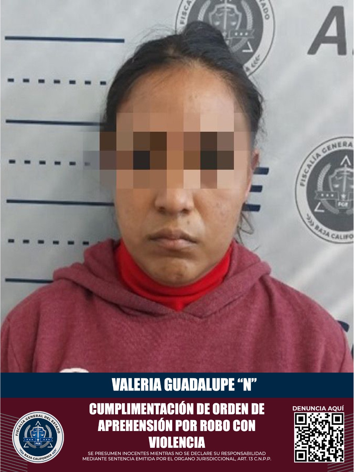 MEXICALI, B.C. La Fiscalía Regional de Mexicali, cumplimentó orden de aprehensión a Valeria Guadalupe “N”, quien presuntamente cometió el delito de robo con violencia calificado cometido por dos o más personas.