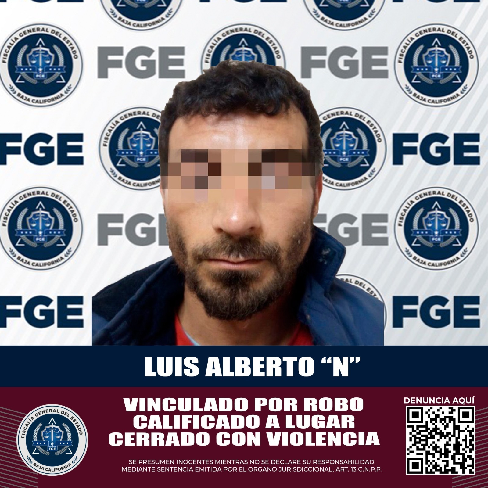 MEXICALI, B.C. La Unidad de Investigación de Robos Oriente de la Fiscalía Regional de Mexicali, mediante el trabajo realizado en la integración de la carpeta de investigación, obtuvo la vinculación a proceso de Luis Alberto “N”, quien presuntamente cometió el delito de robo calificado a lugar cerrado con violencia.