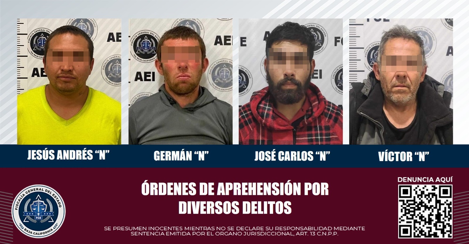 TIJUANA, B.C. La Fiscalía General del Estado cumplimentó órdenes de aprehensión en contra de cuatro hombres, quienes en expedientes penales por separado son señalados por robo de vehículo, robo con violencia y narcomenudeo.