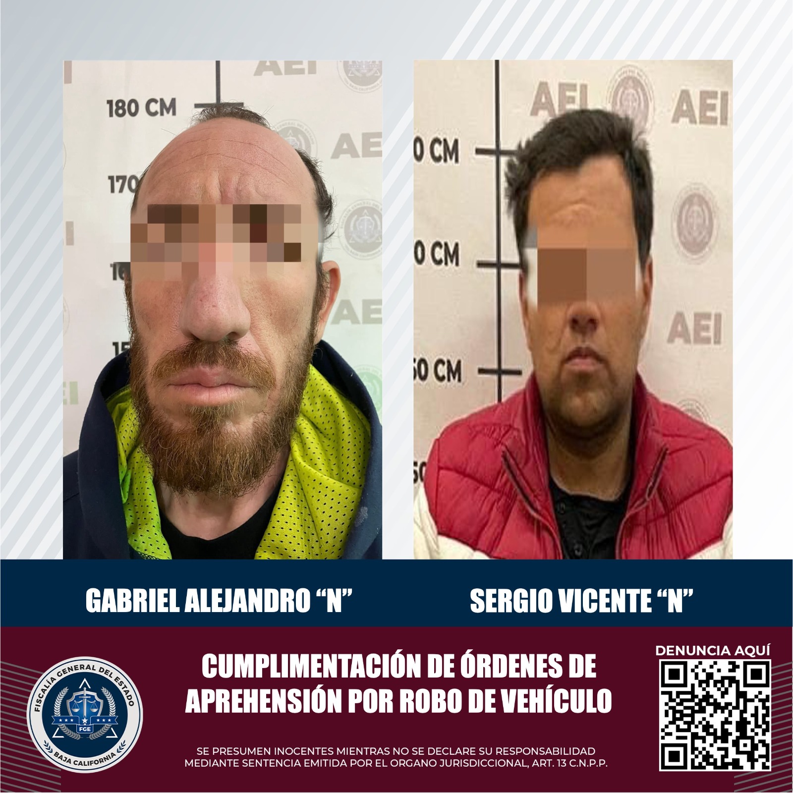 MEXICALI, B.C. La Fiscalía Regional de Mexicali, a través del trabajo realizado por agentes de investigación, logró la cumplimentación de órdenes de aprehensión contra dos sujetos por el delito de robo de vehículo.