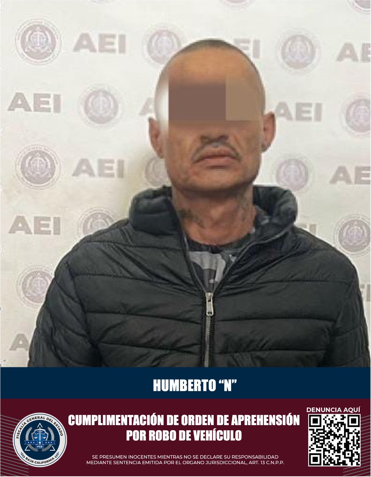MEXICALI, B.C. La Fiscalía Regional de Mexicali informa que la Unidad de Investigación de Delitos Contra Robo de Vehículos, a través de elementos de la Agencia Estatal de Investigación, cumplimentó una orden de aprehensión en contra de Humberto “N”.