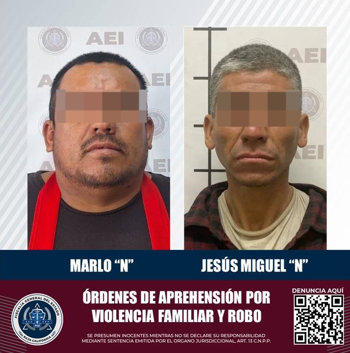 ENSENADA, B.C. La Fiscalía General del Estado, a través de elementos de la Agencia Estatal de Investigación (AEI), cumplimentó órdenes de aprehensión a dos sujetos, a quienes se les atribuye violencia familiar y robo.