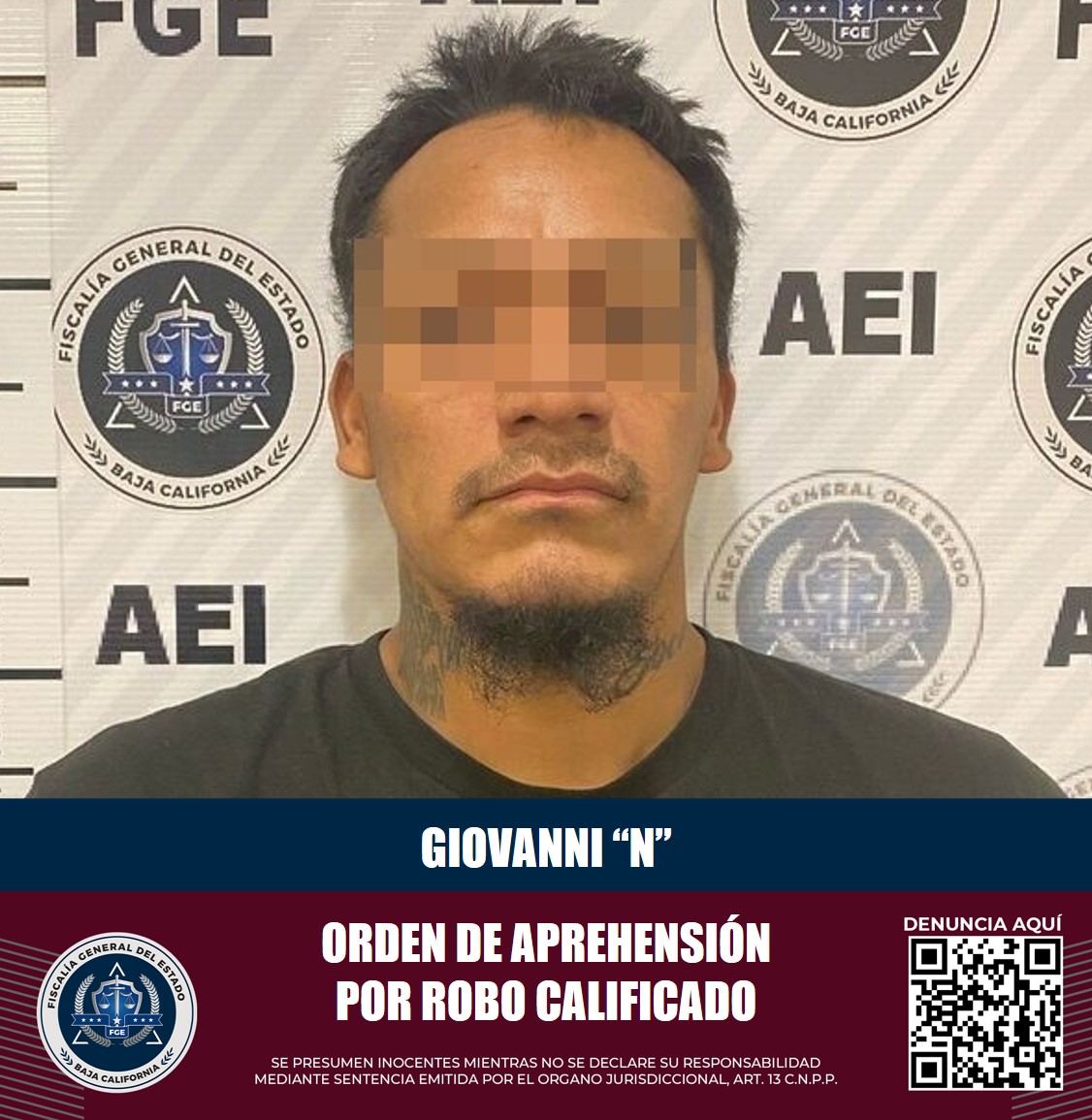 TIJUANA, B.C. Elementos de la Agencia Estatal de Investigación (AEI), de la Fiscalía General del Estado (FGE), llevaron a cabo la ejecución de una orden de aprehensión en contra de Giovanni “N” por la posible comisión del delito de robo calificado cometido a establecimiento abierto al público ejecutado con violencia.