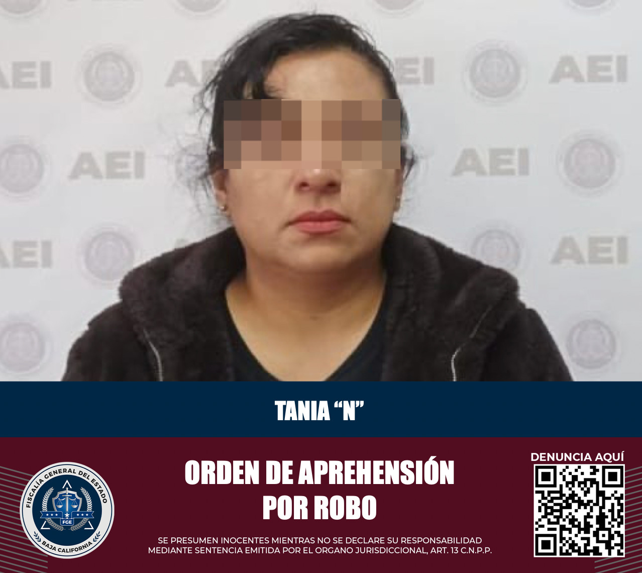 ENSENADA, B.C. Agentes de la Fiscalía General del Estado cumplimentaron una orden de aprehensión contra una mujer por el delito de robo, tras hechos que tuvieron lugar en un domicilio de la colonia Ampliación 89.