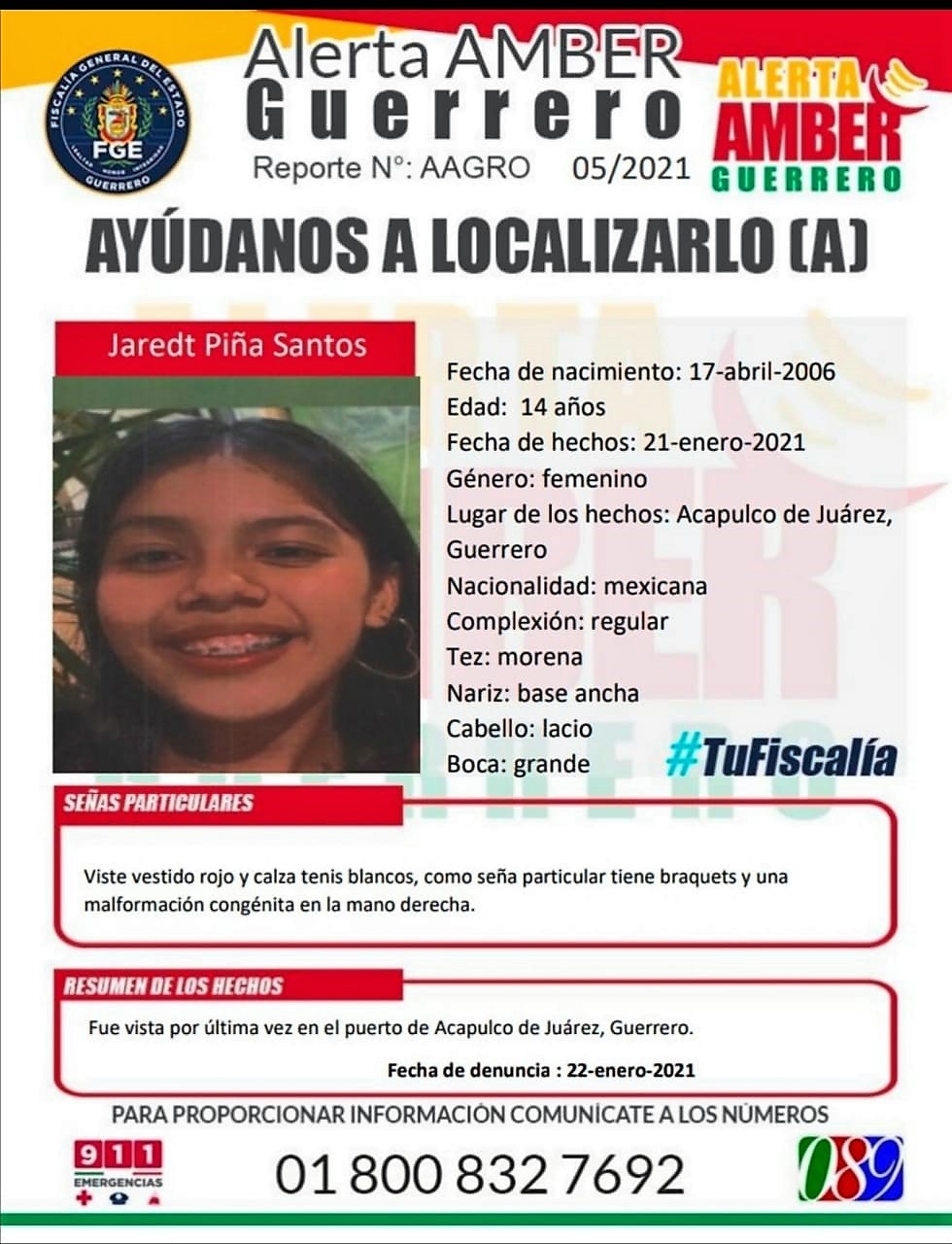 Por lo anterior, se solicita el apoyo para su localización, cualquier información relacionada con esta Alerta Amber, favor de reportarla al número telefónicos de emergencia 911, al de denuncia anónima 089, o al número telefónico 661-613-18-98, en Playas de Rosarito.