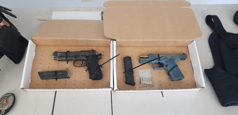 Al detenido se le confiscó una pistola y 1 cargador abastecido con 5 cartuchos útiles calibre 9 milímetros, además de un arma replica con un cargador abastecido por gas, así como una placa metálica con la leyenda “Oficial Policía, Ensenada”