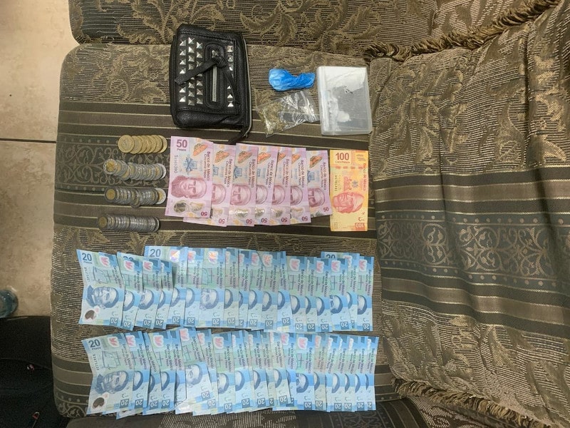 También fueron confiscados 12 envoltorios con lo que al parecer es metanfetamina, 26 gramos de una hierba verde y seca similar a la marihuana, y 934 pesos que se presume son producto de la venta de droga.