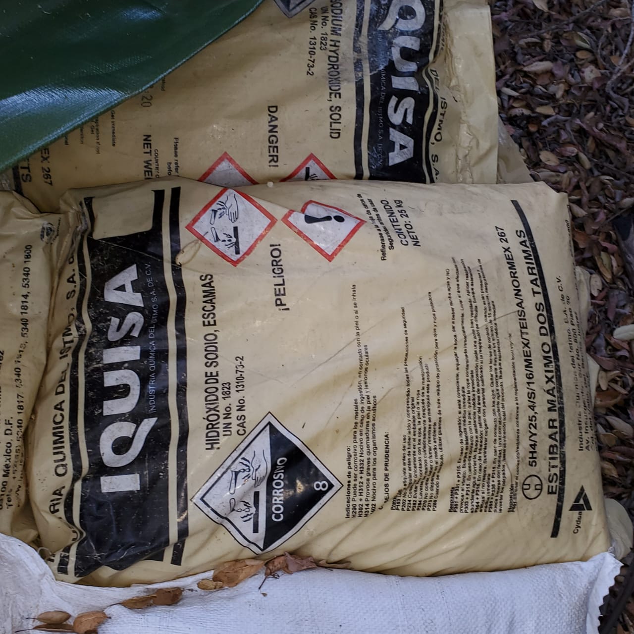 Además, 40 bolsas de Hidróxido de Sodio (Sosa cáustica), con un peso total de 1000 kilogramos, 15 bolsas de color blanco sin identificación, con peso total de 375 kilogramos, 80 costales de color blanco sin identificar con un peso total de 2000 Kg, 2 tanques de almacenamiento de acero inoxidable de una capacidad aproximada de 1000 litros, 2 tanques de almacenamiento de acero inoxidable de una capacidad  de 200 litros y 2 tanques de acero inoxidable de 3 metros de largo y un diámetro de 50 centímetros.