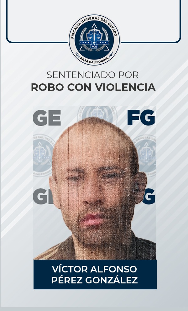 TIJUANA, B.C. Datos de prueba presentados por el Ministerio Público de la Fiscalía Regional de Tijuana ante un Juez de Control, permitieron la obtención de una sentencia de 3 años 6 meses para Víctor Alfonso Pérez González responsable penalmente del delito de robo con violencia.